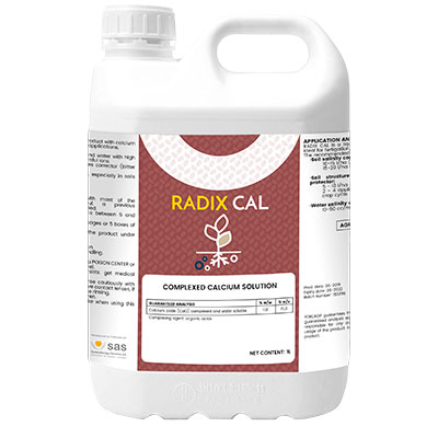 14% w/v Кальций (CaO) + 2,8% w/v Магний (МgO) + Микроелементы (В, Mo,Co) + Органические кислотыRADIX CAL 5 - это жидкий органический комплекс кальция, магния и микроэлементов, рекомендуемый, для увеличения коэффициента усвоения элементов питания из почвы. Благодаря специально подобранным кислотам имеет способность переводить недоступные для растения формы удобрений в доступные. Препарат эффективно борется с натриевым засолением почв. Его регулярное применение позитивно влияет на налив плода и его качество. Особо эффективен препарат в почвах с неоптимальным PH. Свойства: