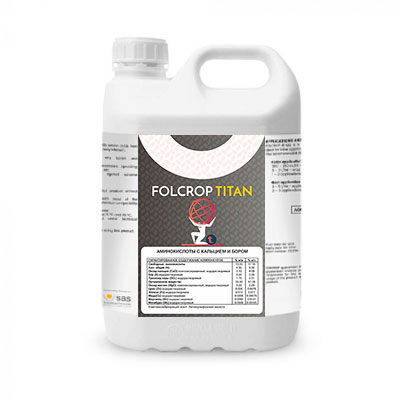 6,0% w/v Азот (N) + 4,09% w/v Оксид кальция (CaO) + 0,26% w/v Бор (B) + 2,31% w/v Триоксид серы (SO3) + 47,38% w/v Органическое вещество + 17,16% w/v Свободные аминокислотыФолькроп Титан – это органический биостимулятор с кальцием и высоким содержанием свободных аминокислот растительного происхождения с энзиматической реакцией и реакцией синтеза, содержит бор и азот, соединенные с большим количеством органических соединений.